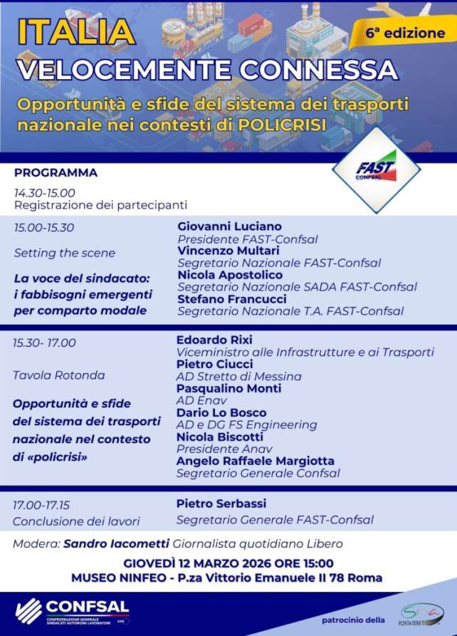 Il 12 marzo a Roma, al Museo Ninfeo, il settore dei trasporti italiani torna al centro di un confronto che ha un valore ben più ampio del calendario convegnistico. La sesta edizione di “Italia Velocemente Connessa”, promosso da Fast-Confsal, mette infatti in fila alcuni dei punti più delicati della fase attuale: carenza di personale, ritardi negli investimenti, squilibri territoriali, qualità del lavoro e capacità del Paese di reggere una stagione di pressioni simultanee. Non è un tema tecnico. È uno dei banchi di prova della competitività italiana.